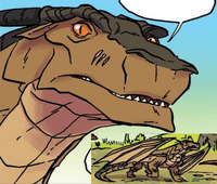 Hat rote und goldene Schuppen, sowie orangefarbene Augen[102] und trägt eine graue Rüstung.[106]